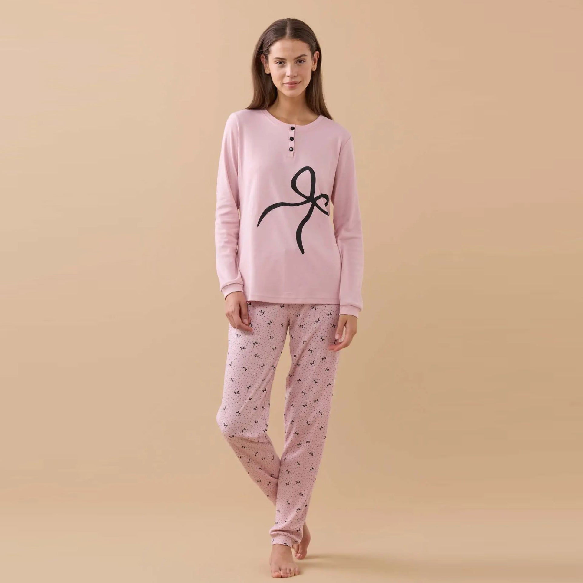 FA9250 - Pigiama donna caldo cotone big fiocco con polsini