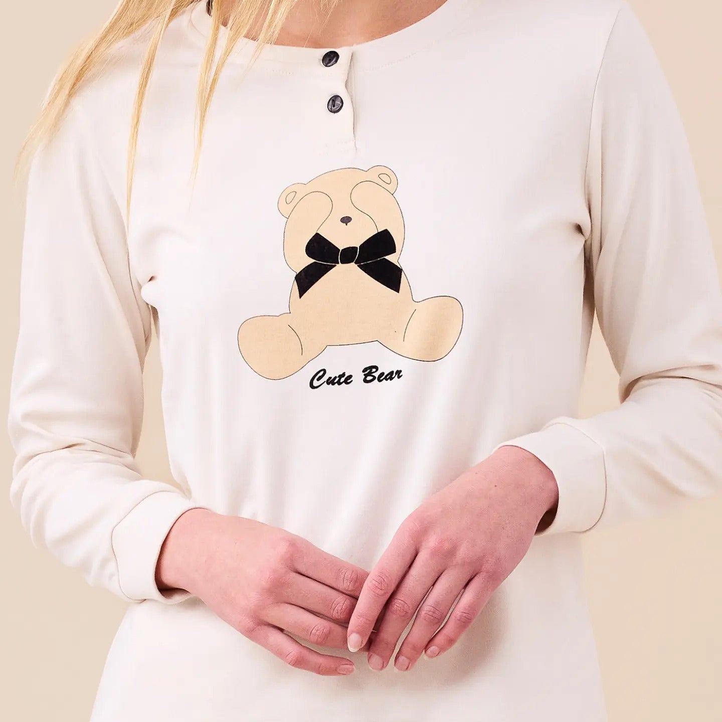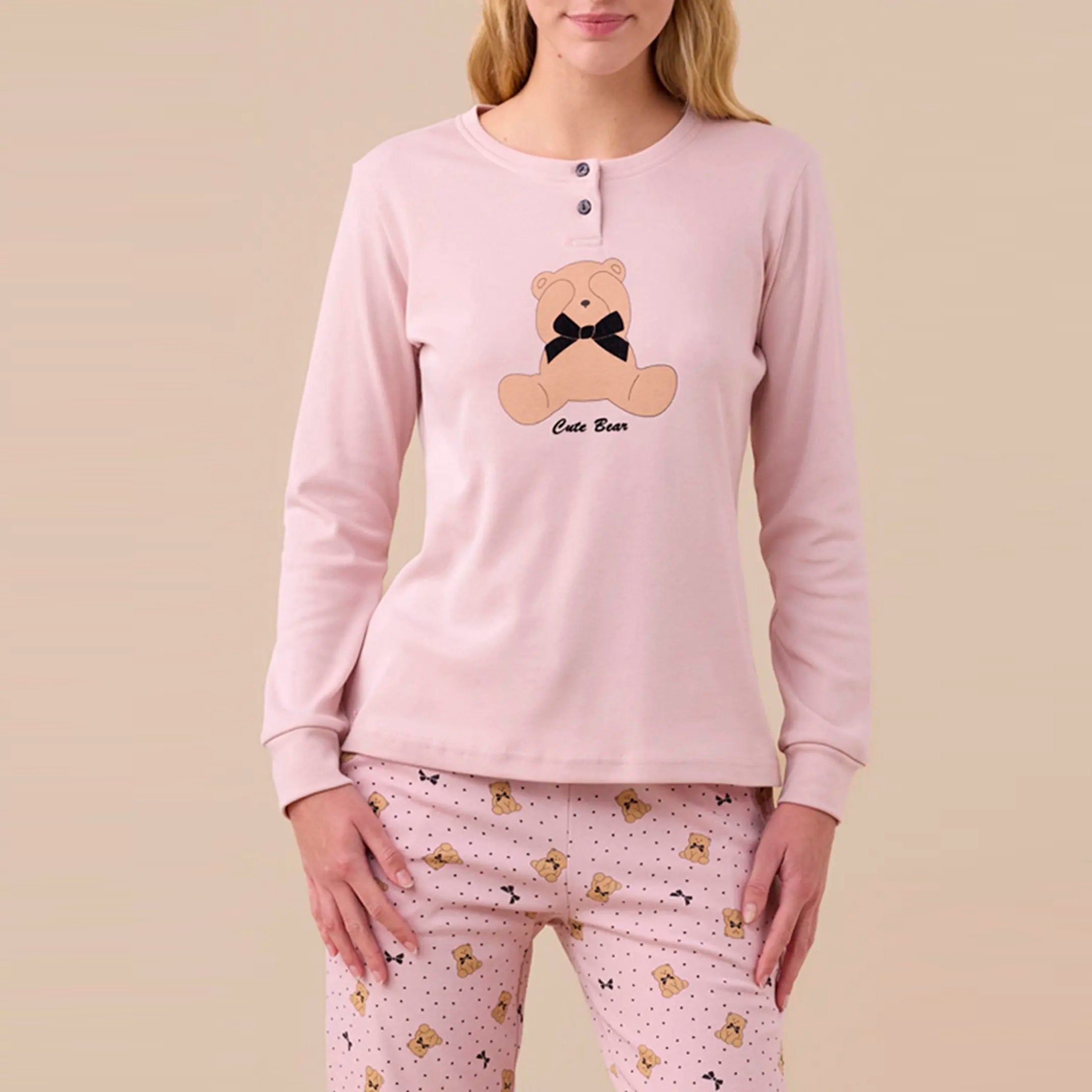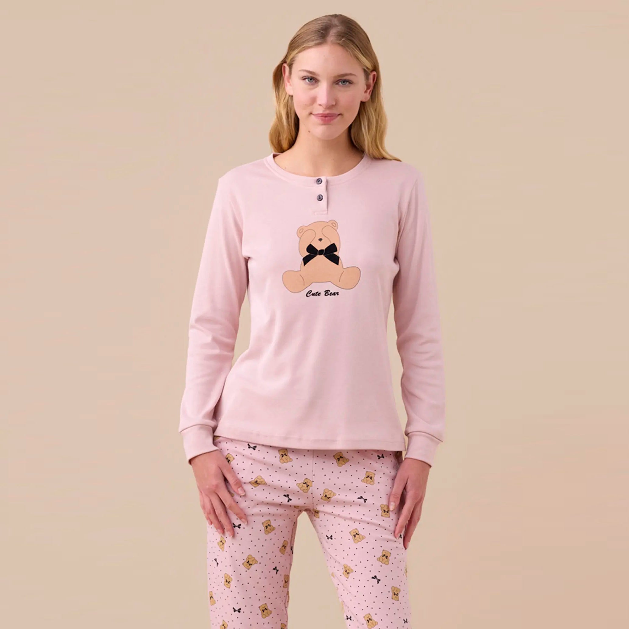 Pigiama donna in caldo cotone con stampa orsi e fiocchi. Maglia manica lunga con due bottoni e applicazione con orso e fiocco in velluto e pantaloni con tasche e polsini sul fondo.