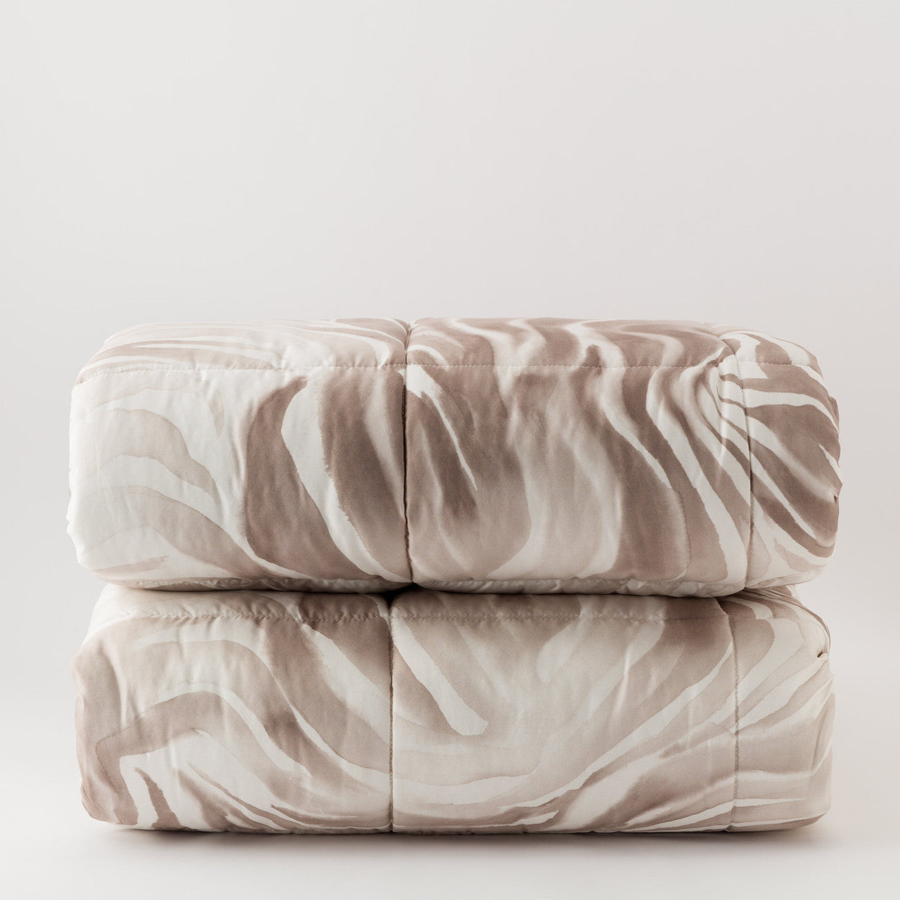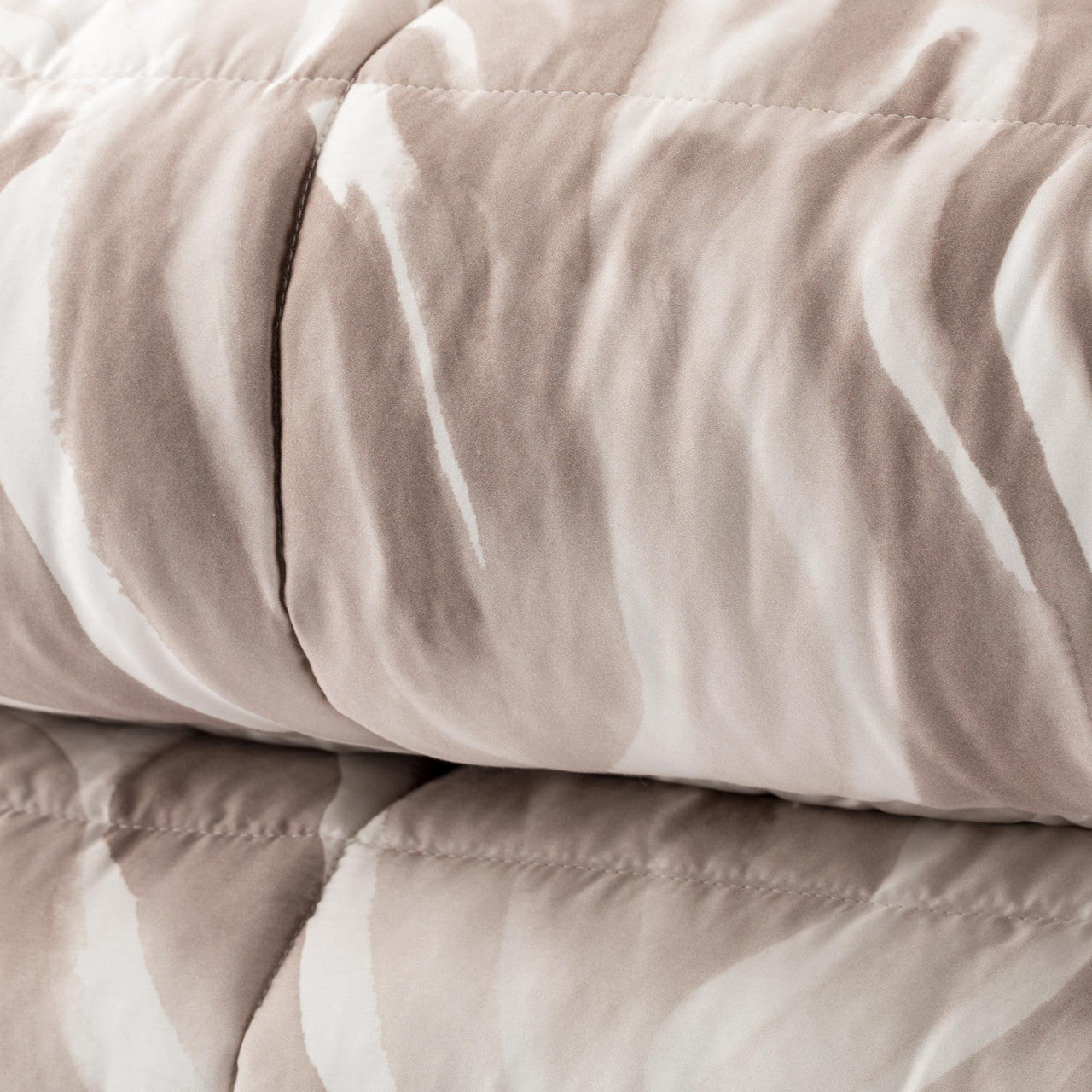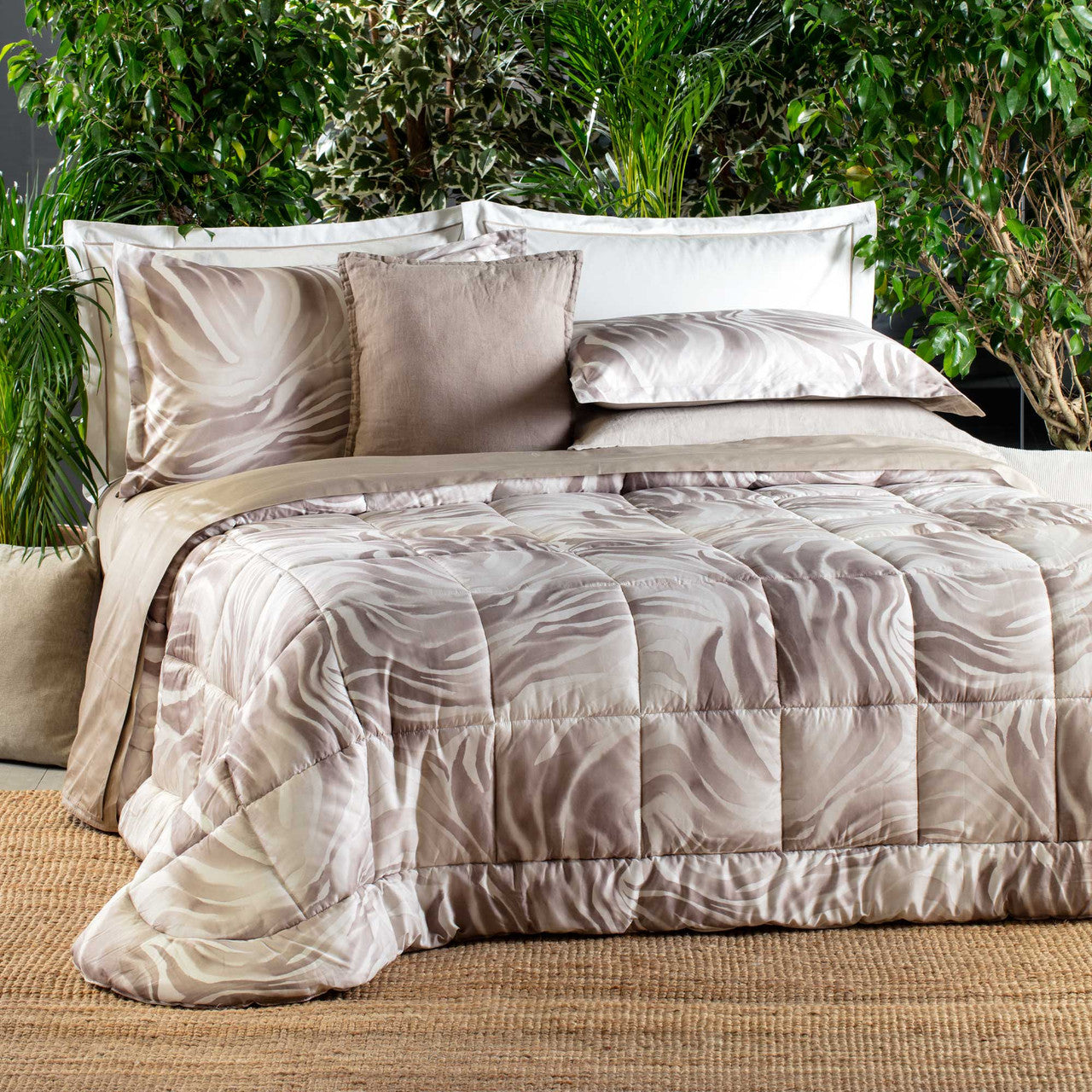 La trapunta Sauvage interpreta la forza della natura con un disegno deciso e raffinato. La stampa digitale su raso di cotone 300 fili crea linee organiche che ricordano paesaggi incontaminati, trasformando il letto in un elemento di design unico.