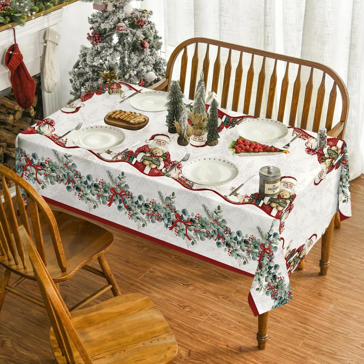 Il design raffigura una suggestiva scena natalizia con Babbo Natale sorridente, circondato da pacchetti regalo, orsetti e decorazioni tipiche. Il bordo è impreziosito da una ghirlanda di eucalipto e bacche rosse intrecciate con nastri natalizi, che percorre tutto il perimetro donando un tocco raffinato e festoso. I colori caldi del rosso e del verde, su fondo chiaro con motivi tono su tono, rendono la tovaglia vivace e accogliente, perfetta per creare un’atmosfera gioiosa attorno alla tavola delle feste.