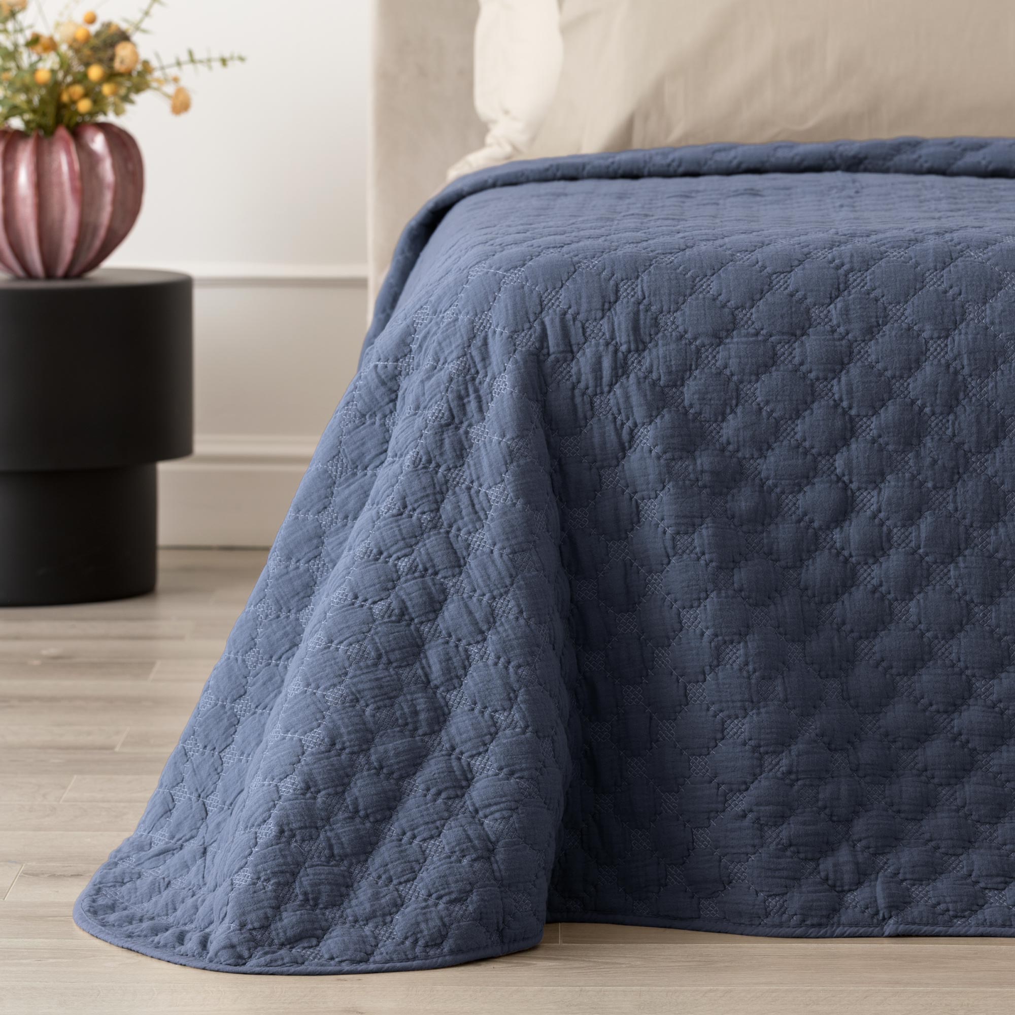 Il quilt Rombus in mussola di cotone si caratterizza per una lavorazione ricamata a motivo geometrico che dona profondità e movimento alla superficie rifinita. La texture morbida della mussola garment washed esalta l’effetto naturale del tessuto, creando un copriletto dall’estetica contemporanea ma accogliente. Disponibile nelle tonalità bianco, tortora, malva, denim e oliva, si inserisce con facilità in ambienti moderni, boho o dal gusto essenziale.