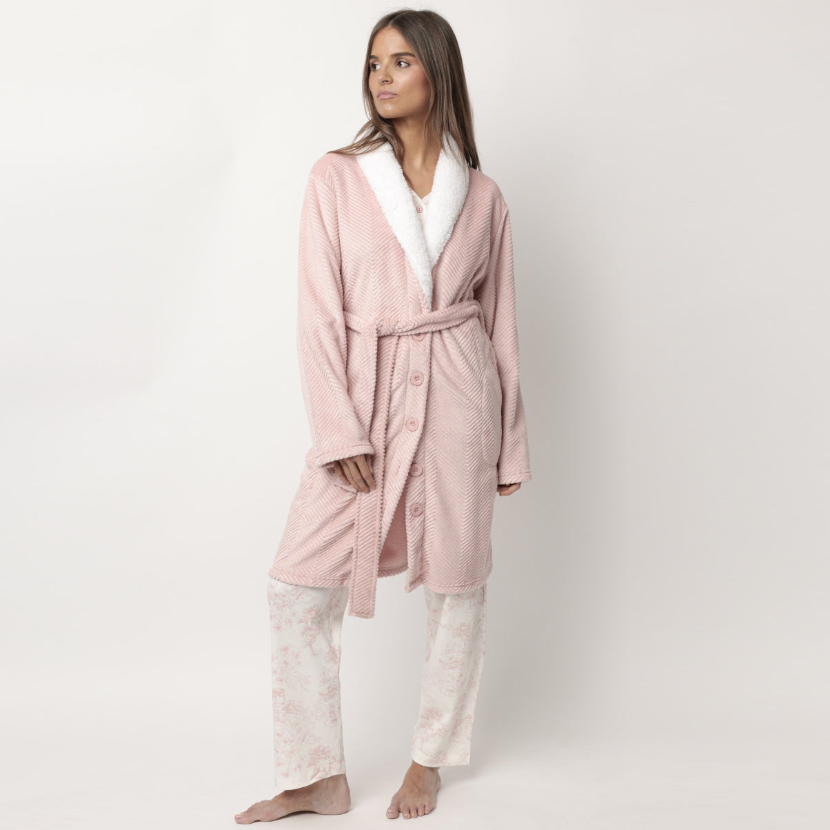 Questa vestaglia in pile super calda presenta un motivo jacquard Coral e maniche lunghe. È disponibile in due combinazioni di colori: nudo e verde foglia.