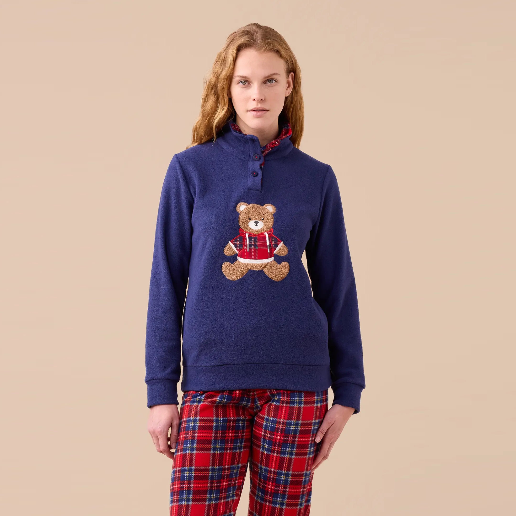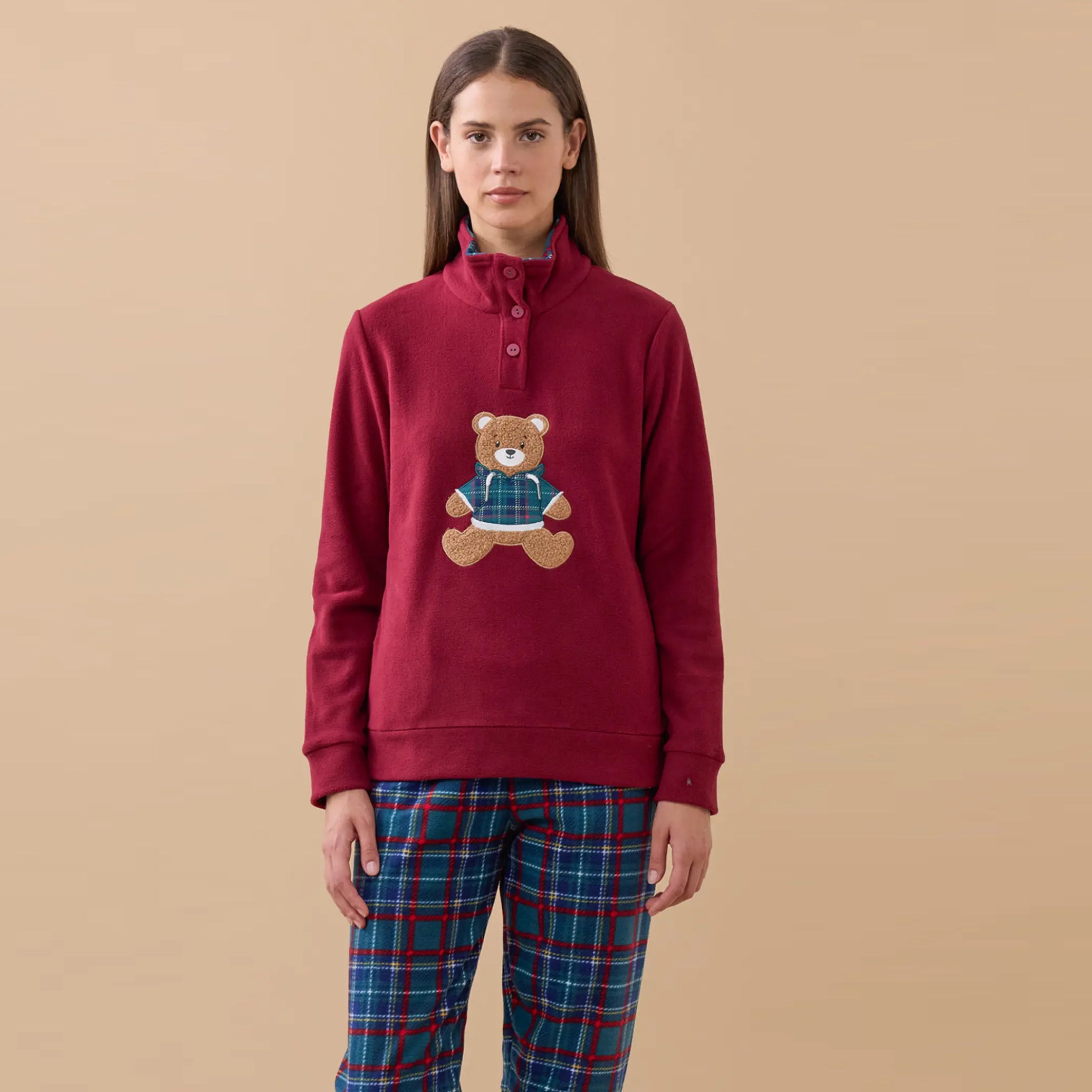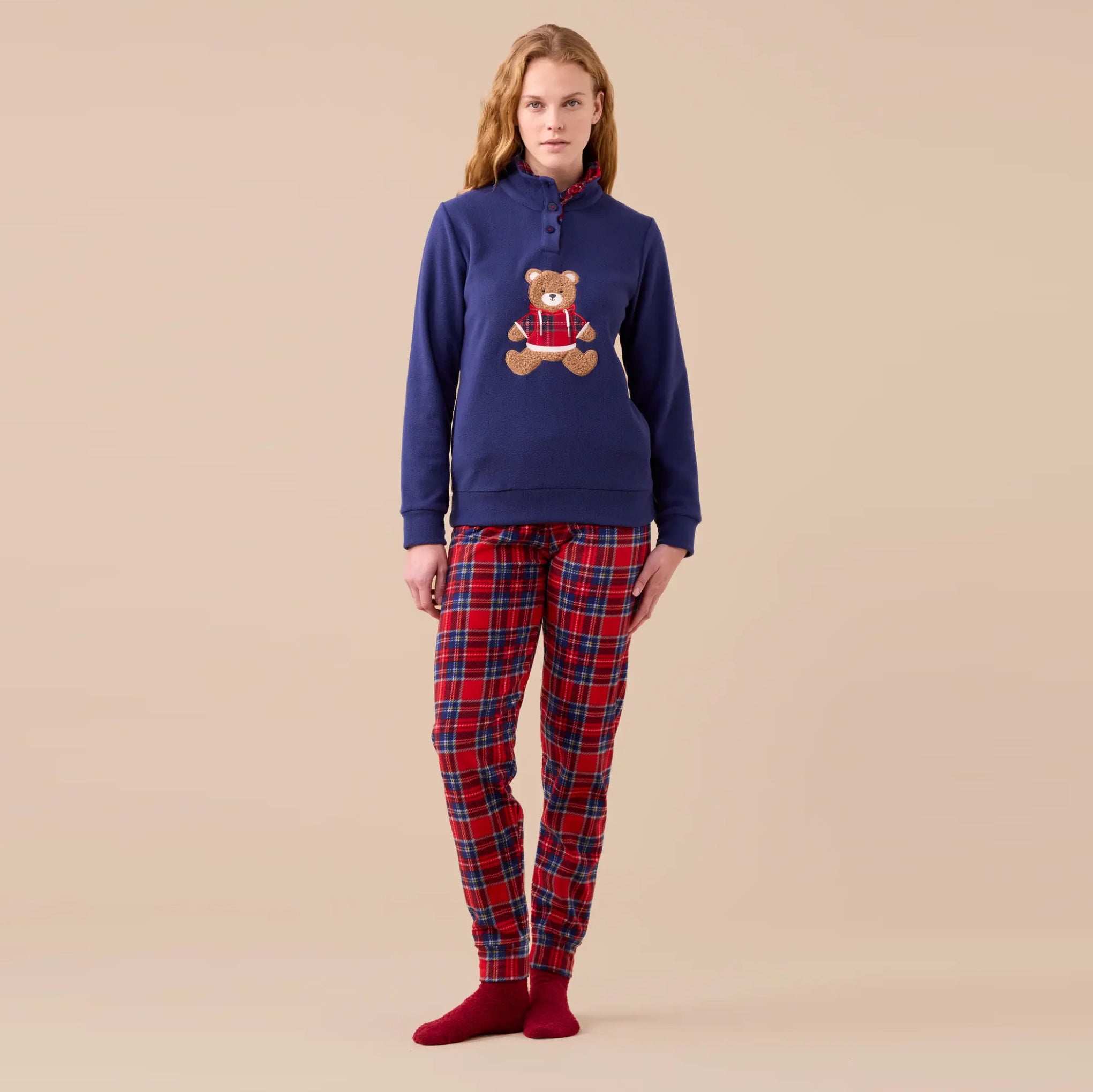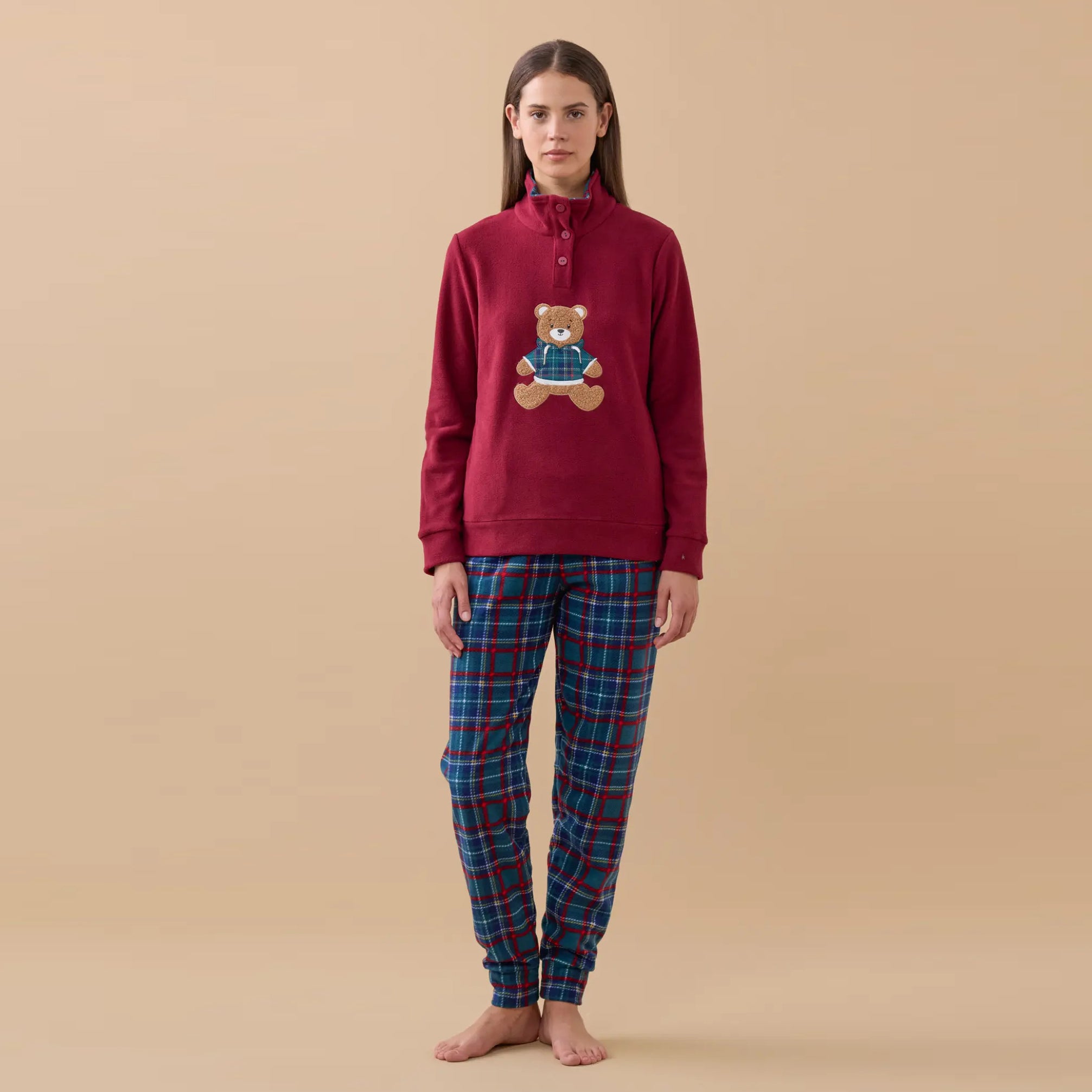 FA9386 -Pigiama in pile con orsetto ricamato scozzese