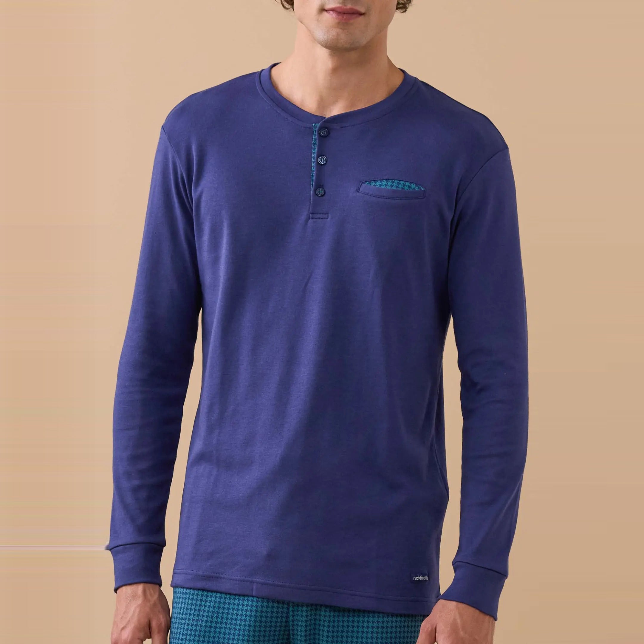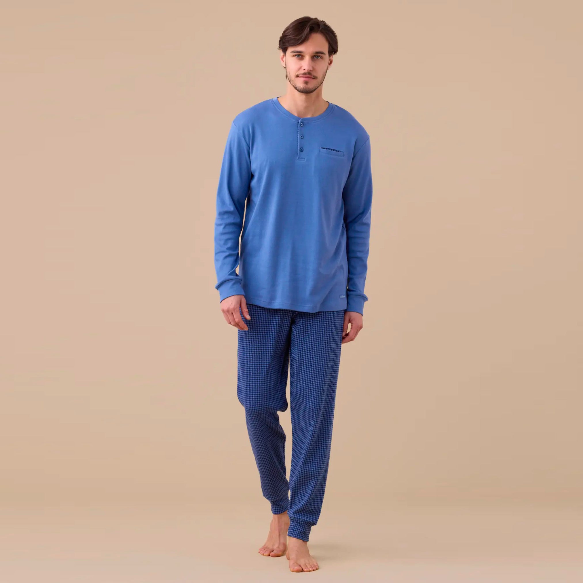 Pigiama uomo invernale in caldo cotone, top di colore unito con collo a tre bottoni e pantaloni in stampa pied de poule con polsino.