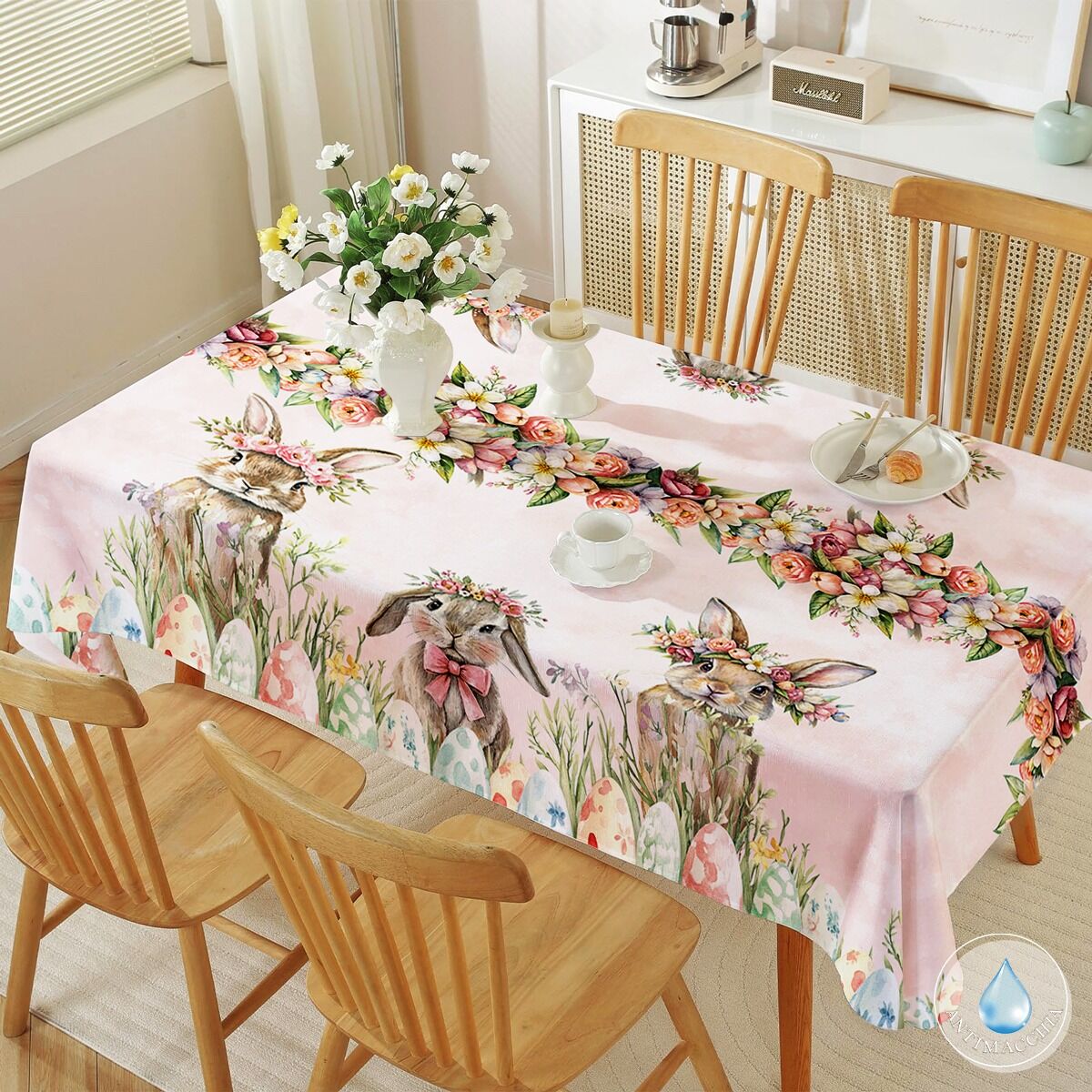 Questa tovaglia pasquale antimacchia modello Letizia è pensata per unire praticità e bellezza, portando in tavola un’atmosfera primaverile delicata e raffinata. Realizzata in poliestere con speciale trattamento antimacchia, è ideale per vivere i momenti conviviali con serenità, perché protegge il tessuto da liquidi e piccole macchie, rendendo la pulizia semplice e veloce. La stampa digitale ad alta definizione valorizza le illustrazioni romantiche dei coniglietti con coroncine floreali, dei motivi botanici e delle uova decorate, creando una composizione armoniosa dai toni pastello che illumina l’ambiente con dolcezza. Il tessuto leggero e resistente mantiene nel tempo la brillantezza dei colori e la nitidezza dei dettagli, offrendo una resa estetica curata anche dopo numerosi utilizzi. Il design elegante e fiabesco rende questa tovaglia perfetta per la tavola di Pasqua, per le colazioni primaverili e per tutte le occasioni in cui si desidera unire stile, accoglienza e funzionalità in un unico gesto.